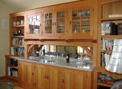 Hand crafted wet bar and bookshelves from recycled Douglas fir